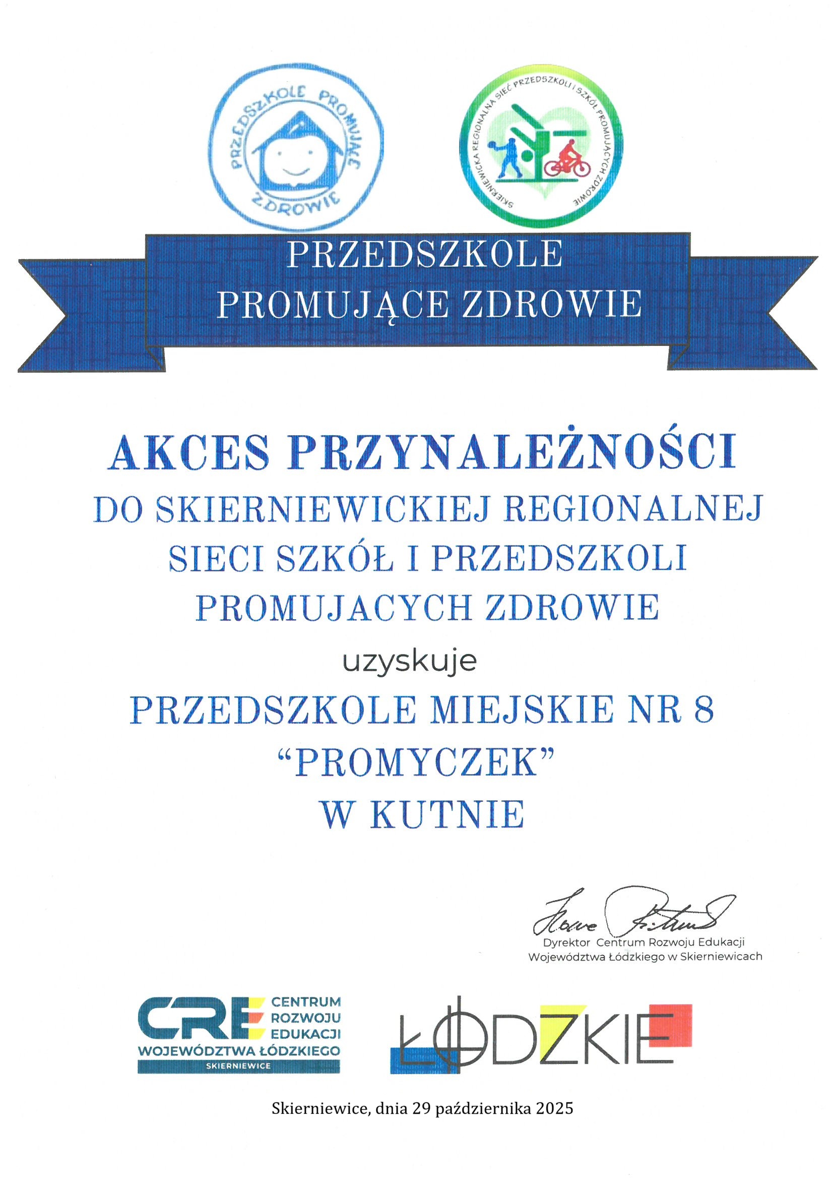 AKCES przynależności do Skierniewickiej Regionalnej Sieci Szkół i Przedszkoli Promujących Zdrowie. [.jpg, 566.32 kB]